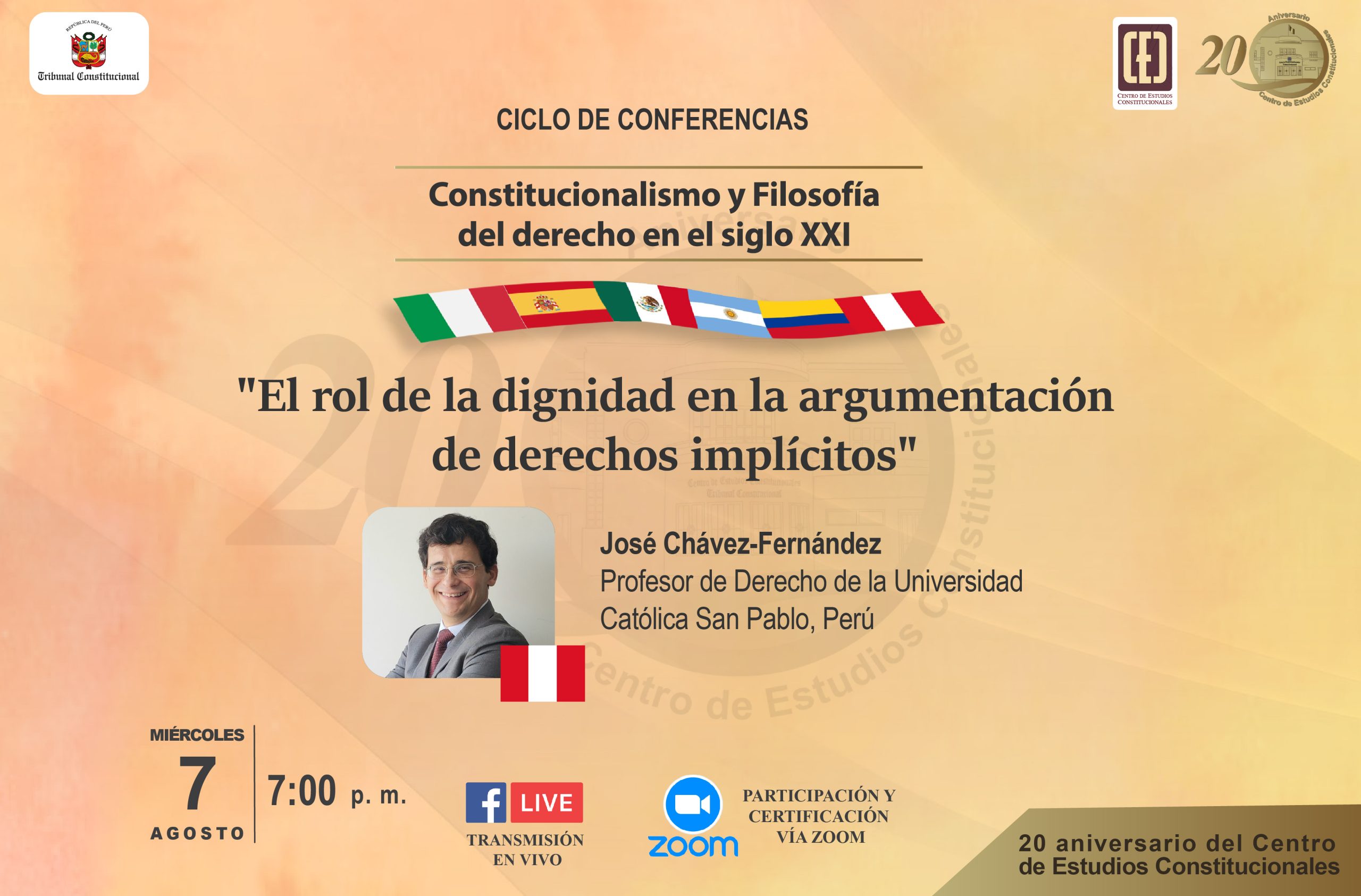 A las 7 de la noche del miércoles 7 de agosto seguirá el ciclo de conferencias “Constitucionalismo y Filosofía del Derecho en el siglo XXI«, organizado por el Centro de Estudios Constitucionales (CEC) del Tribunal Constitucional (TC), en el marco del vigésimo aniversario de creación del CEC, y se tratará sobre «El rol de la dignidad en la argumentación de los derechos implícitos«, cuyo expositor será José Chávez-Fernández, profesor de Derecho de la Universidad Católica San Pablo, Perú.