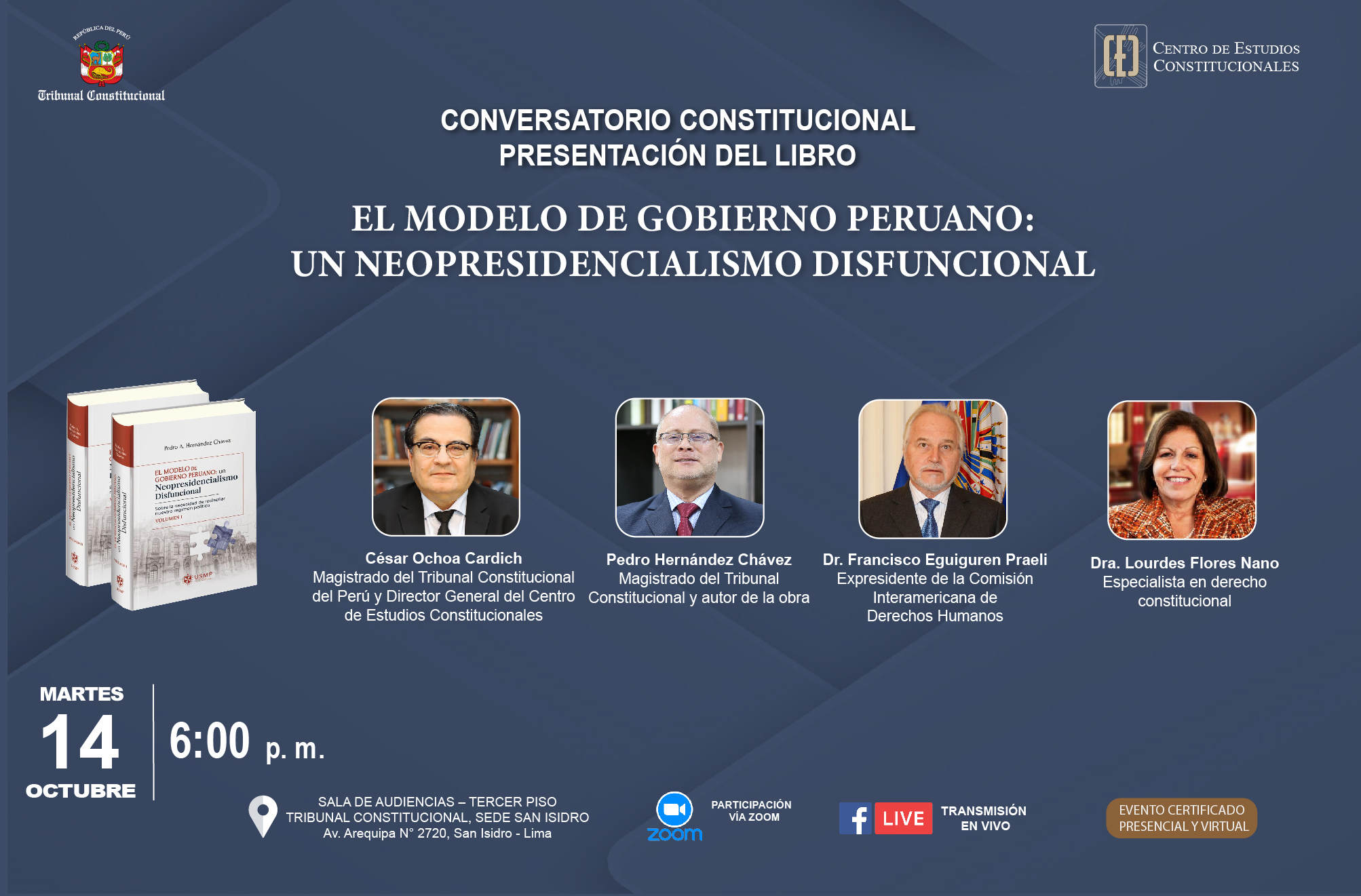 El martes 14 de octubre, a las 6 de la tarde, se desarrollará el Conversatorio Constitucional – Presentación del libro: “El modelo de gobierno peruano: Un neopresidencialismo disfuncional”, escrita por el magistrado del Tribunal Constitucional (TC), Pedro Hernández Chávez.