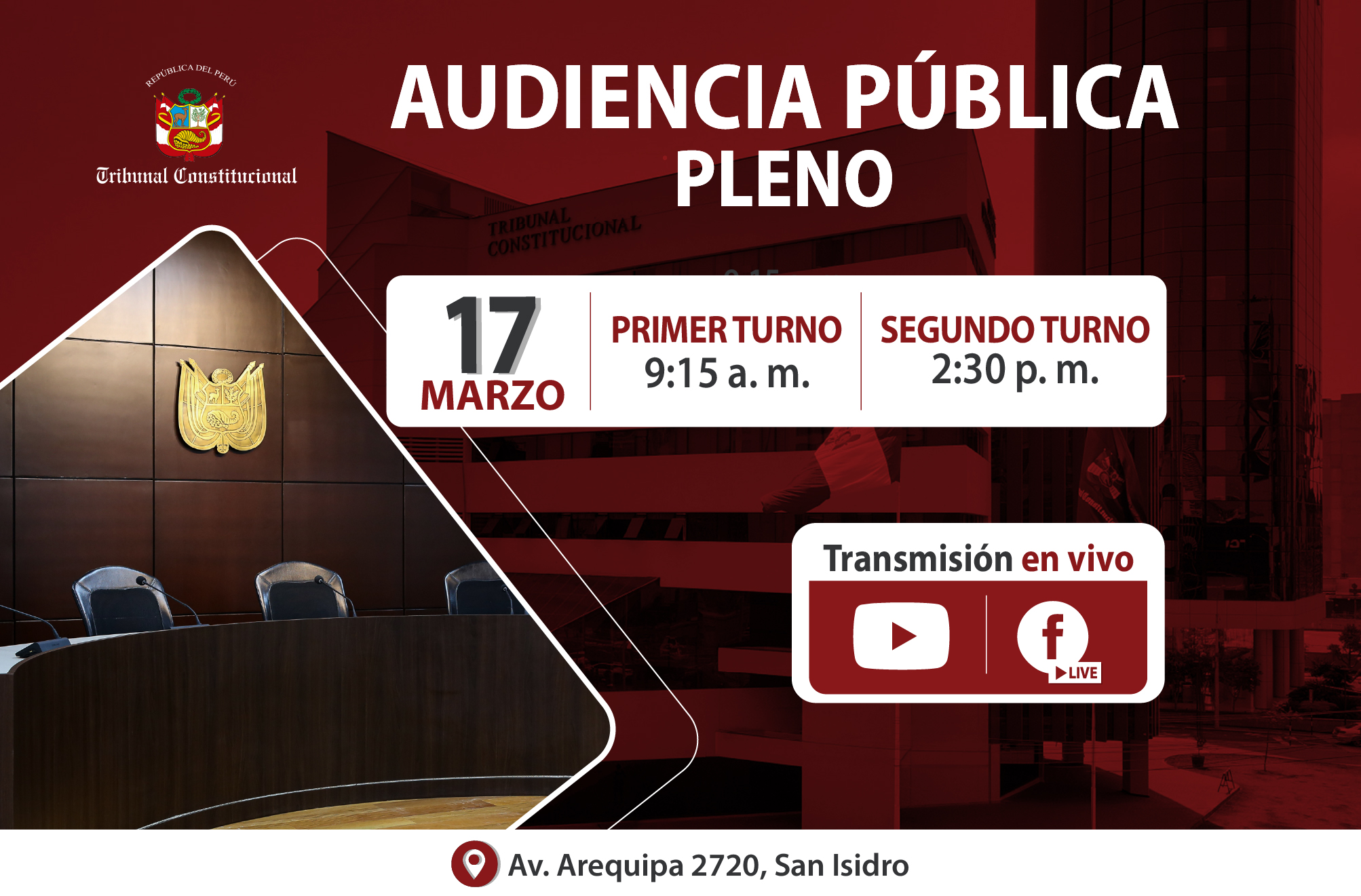 El acto procesal se realizará en la sede de la Av. Arequipa 2720, San Isidro y será transmitida por la página web institucional y redes sociales.