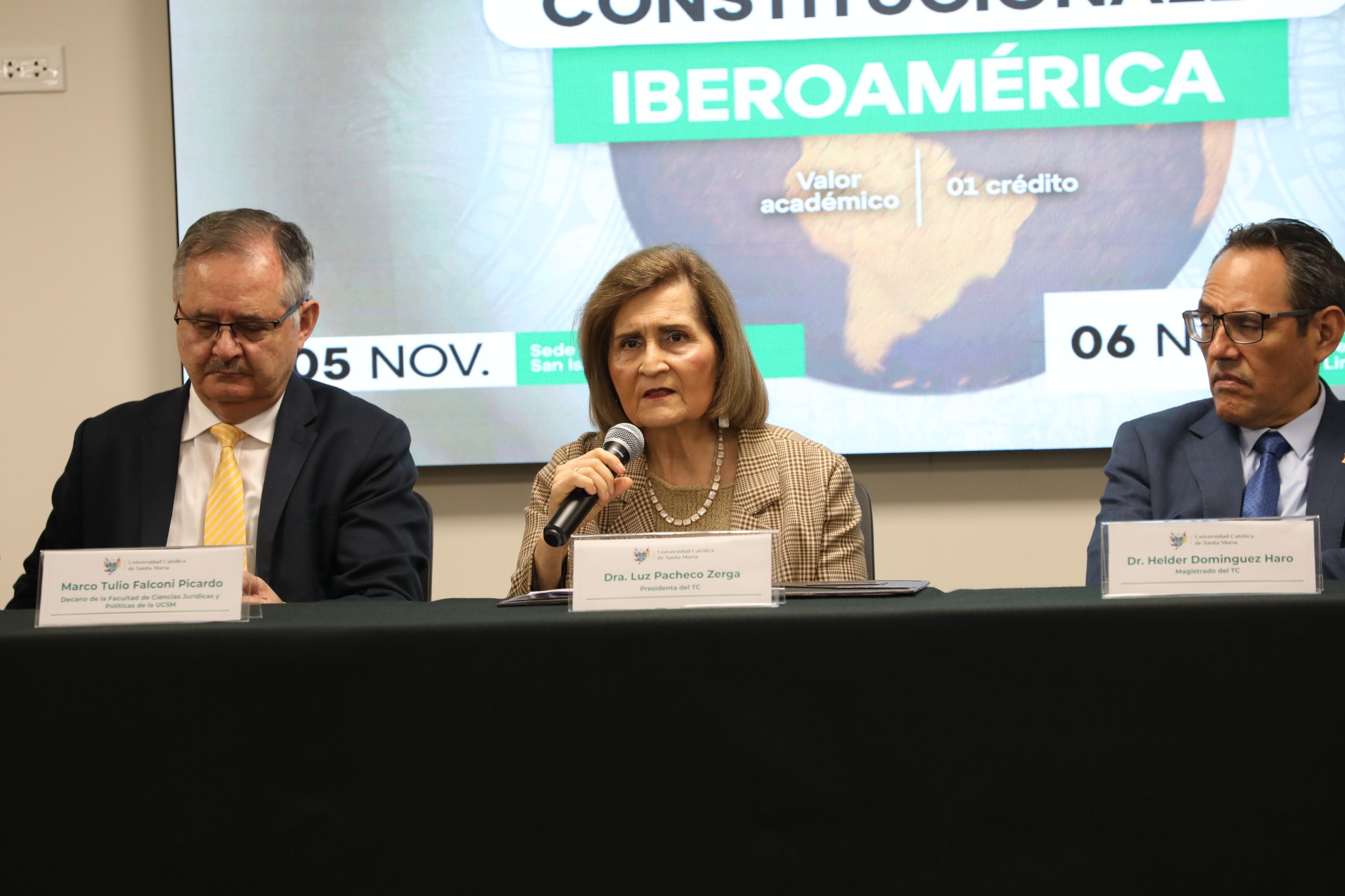 La presidenta del Tribunal Constitucional (TC), Luz Pacheco Zerga, expuso en la actividad académica “Acontecimientos constitucionales Iberoamérica”, que organizó el Centro de Estudios Constitucionales (CEC) y la Universidad Católica de Santa María (UCSM) de Arequipa.