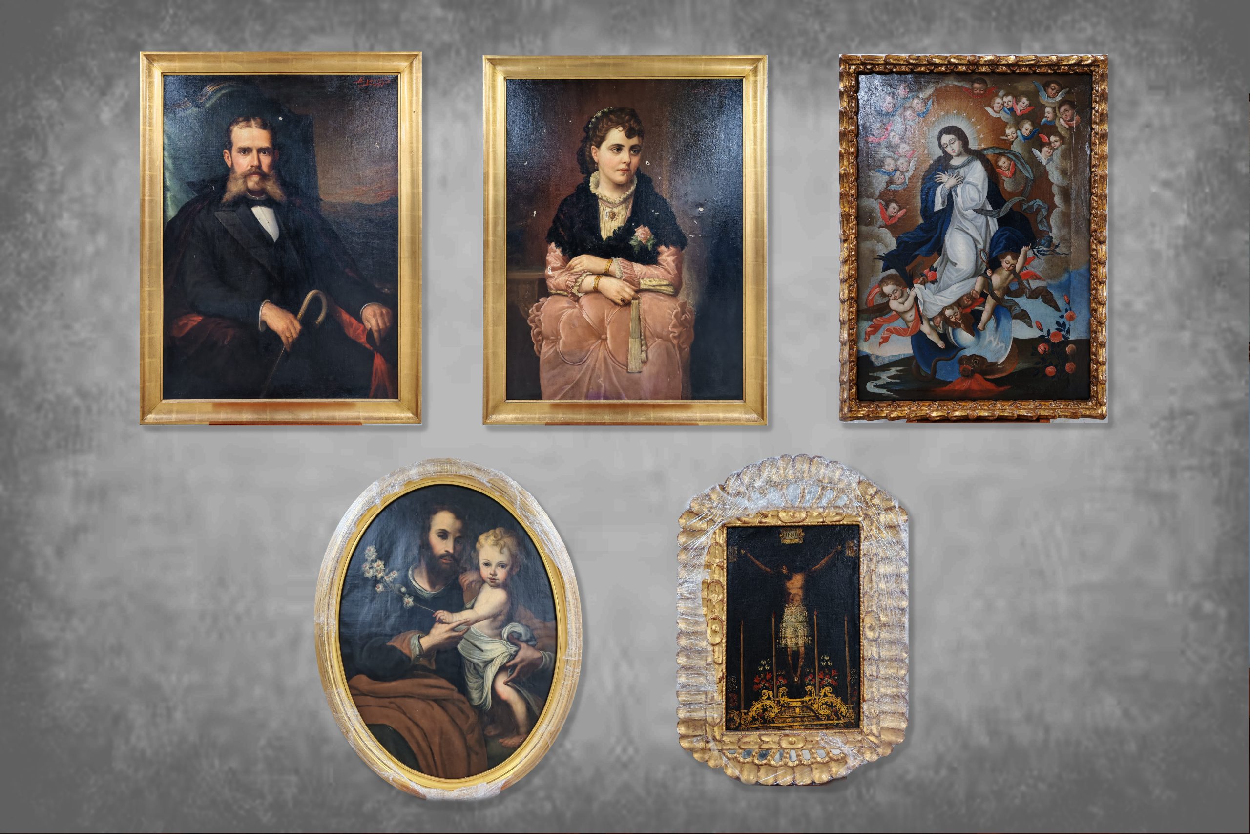 Se trata de cuadros de San José y el Niño, el Señor de los Temblores, la Virgen Quiteña, así como, retratos en oleo de familiares y amigos del recordado expresidente del TC Aguirre Roca.